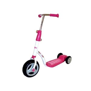 Product Description : Color: PinkFrom the ManufacturerThe Kiddi-oand#174 Scooter Pink is great for that child wanting to mimic their big sister. With a wide front wheel and dual rear wheels it provides great stability while learning balance and coordination. Product Description : Kiddi - o Pink Scooter gets your "Ms. Independent" some wheels of her own! An awesome tot transport, built by the fun folks at Kiddi-o! Just like the "big kids'" version, but with child-safe features like a limited-radius turn wheel that helps prevent tipping. Has an extra-wide foot plate too, for stability while your child rides Synthetic ruberized front tire, EVA foam rear tires for a stable ride; 8-position adjustable handlebar for comfortable riding; High-carbon steel frame with fade-resistant powder-coat finish for maximum durability; Built for cildren ages 18 months to 4 years old; Comes with 3-year manufacturer's warranty on parts. Order yours today! Kiddi-o Pink Scooter